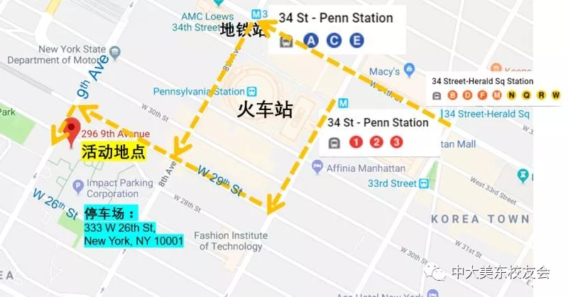 1)乘坐地铁:可在34th 的不同地铁站下车,沿着橙色路线走到活动地点。最近的地铁站是从A、C、E号线的34 St – Penn Station 站,沿着8大道从34街一直走到西29街,然后向右转走到9大道就会看到尖塔的教堂(28街和29街中间)。从地铁站到教堂大约10分钟的路程。 (2)乘坐火车: 乘坐到Penn Station, 沿着橙色路线走到活动地点。 (3)开车: 最近的停车场为Impact Parking Corporation,333 W 26th St, New York, NY 10001 (从9th Ave /W 26th St 往8th Ave开进,在左边)。 其他停车场请参考: https://www.parkme.com/map?lot=17116#296%209th%20Ave%2C%20New%20York%2C%20NY%2010001