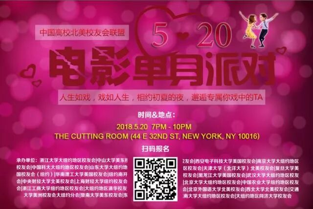 2. 多方位的互动环节。无论你是高冷的金融女,还是木讷的理工男,我们都会让你自然融入,开怀大笑。 3. 前期调研表明,参加活动的校友男女比例相当,年龄从24岁到34岁为主,多为各行各业的年轻精英(金融;科技;传媒;科研;艺术;法律;企业家等) 4. 大数据的分析和匹配。我们的专业分析团队将通过大数据提前为参加活动的校友们进行匹配。我们还将在活动前建立聚会微信群,让校友会在参加聚会前可以在网上先互相熟络,聚会后也可以继续联络。 1. 年满21岁或以上的单身校友及校友二代,欢迎个人或者携伴参加; 2. 入场需出示电子版或者打印的门票和身份证; 3. 男生女生各150张票,先到先得,售完即止。 时间:2018年5 月20 日 晚上7PM - 10PM 地点:The Cutting Room 44 East 32nd St, New York, NY, 10016 http://thecuttingroomnyc.com 标准票价:$35 Early Bird 优惠价:$25 (门票皆含派对入场券及一杯非酒精饮品) Early Bird报名截至日期:5月9日晚上11点 报名链接:https://www.eventbrite.com/e/520-tickets-45367284770 请输入承办校友会提前报名注册码:alumnionly 联系人:宫茜 sysuaa.usa@gmail.com 长按右方二维码进行购票 提前报名注册码: alumnionly (或点击文末阅读原文) The Cutting Room 位于纽约曼哈顿中城帝国大厦旁,是一个由伯克利音乐学院校友Steve Walter和曾出演Sex and the City, Law and Order, 及The Good Wife 等家喻户晓脍炙人口剧作的知名演员Chris Noth共同所有的集醉人鸡尾酒和浪漫爵士乐等于一体的优雅休闲酒吧。 该酒吧众星云集,包括John Mayer、Lady Gaga、 Sting、Sheryl Crow 及已故传奇巨星David Bowie等知名音乐人都曾于该酒吧登台献艺,一展风采。酒吧秉承“为新人提供充分崭露头角的空间,为明星提供酒吧小众表演氛围的舞台”的宗旨,将室内空间设计成浓郁低调优雅华丽的风格,与各路艺术家的精彩演出交相辉映,相得益彰。平时的演出入场门票平均$45以上。嗯,我们的门票多少钱来着?只要$25,还包含饮料! 承办单位(排名不分先后): • 中山大学美东校友会 • 浙江大学大纽约地区校友会 • 西安电子科技大学美国校友会 • 南京大学大纽约地区校友会 • 中国科大大纽约地区校友会 • 山东大学大纽约地区校友会 • 天津大学(北洋大学)北美校友会 • 复旦大学美国校友会(纽约) • 华南理工大学美国校友会 • 纽约南开校友会 • 黑龙江大学美国校友会 • 武汉大学大纽约地区校友会 • 中央财经大学北美校友会 • 上海财经大学纽约校友会 • 北京大学大纽约地区校友会 • 中国农业大学纽约地区校友会. • 浙江工商大学纽约地区校友会 • 大纽约地区清华校友会 • 北京外国语大学北美校友会 • 西北大学北美校友会 • 交通大学美洲校友会大纽约分会 • 暨南大学美东校友会 • 东南大学大纽约地区校友会 • 大纽约地区同济大学校友会 图文编辑:杨家怡(中山大学) 文案:赵靖(黑龙江大学)、杨静(西安电子科技大学)、Evie(北京外国语大学)